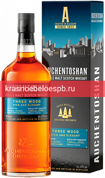 Виски Auchentoshan Three Wood обладает гармоничным насыщенным вкусом, в котором сочетаются ноты сухофруктов, кураги инжира и цукатов из апельсина, подчеркнутые оттенками пряных специй — корицы и лакрицы. В приятном продолжительном послевкусии раскрываются тона крем-брюле и лесных орехов, дополненные терпкостью дубовых танинов.