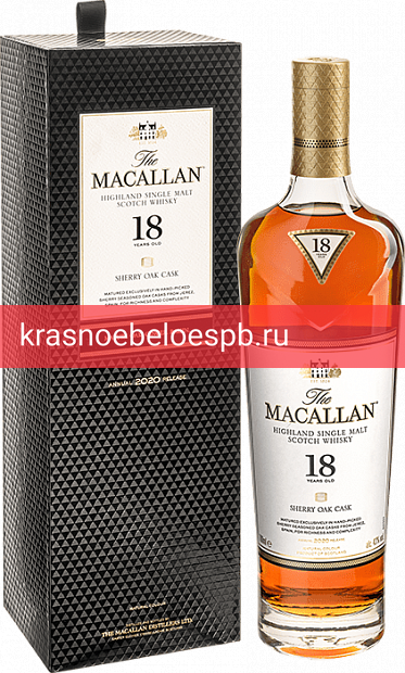 Виски The Macallan Sherry Oak 18 Years входит в линейку односолодовых виски Sherry Oak с насыщенным и сложным вкусом, для выдержки которых используются только дубовые бочки из-под хереса Oloroso, поштучно отобранные на винодельнях в окрестностях испанского города Хереса. Богатый вкус с нотами дуба, имбиря и изюма дополняется красивым натуральным цветом светлого красного дерева.